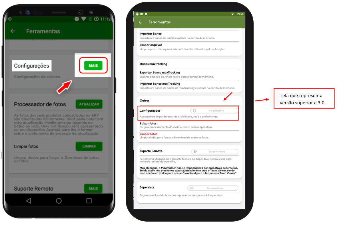 2. Já dentro de ferramentas localize a opção de Configurações e logo em seguida clicar na opção MAIS. Caso esteja em versão posterior a 3.0 a informação aparece de forma diferente, em configurações clique em ver parâmetros.
