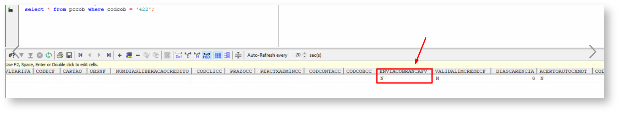 4- Também pode ser verificado na tabela, coluna ENVIACOBRANCAFV se está marcado como Não, nesse caso a divergência se dá devido o Winthor não estar enviando para o maxPedido.