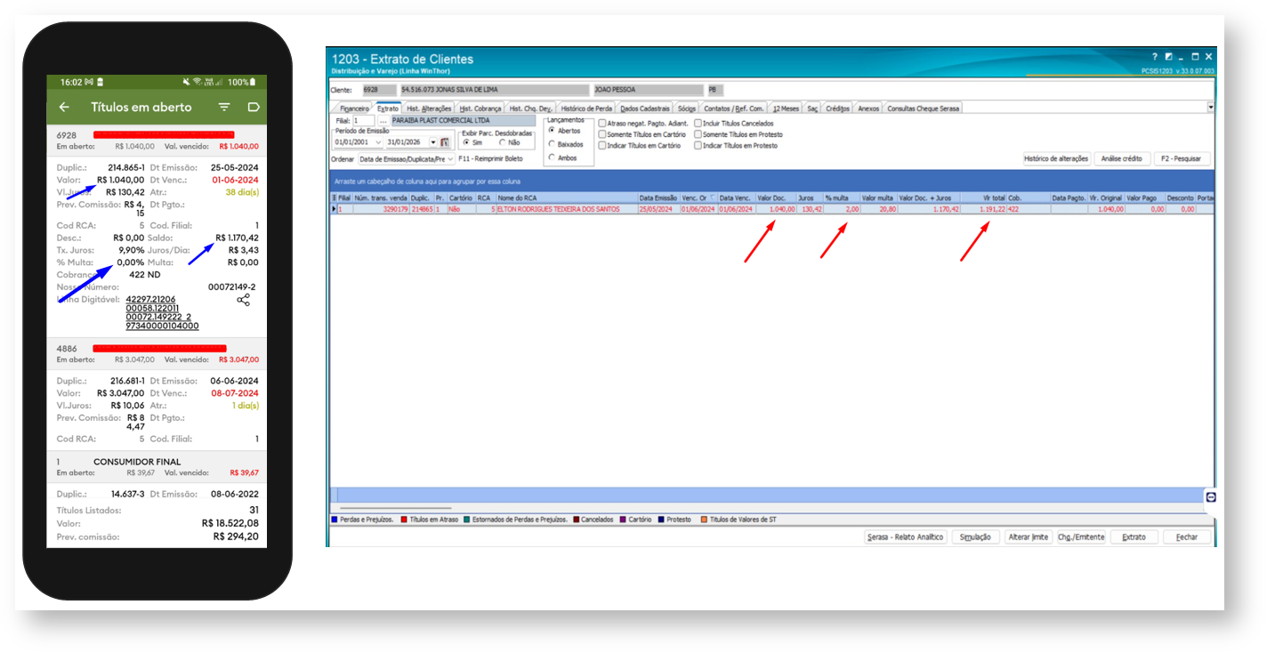 2- Verifique se há divergência de valor entre o aplicativo e o Winthor rotina 1203, referente a multa.