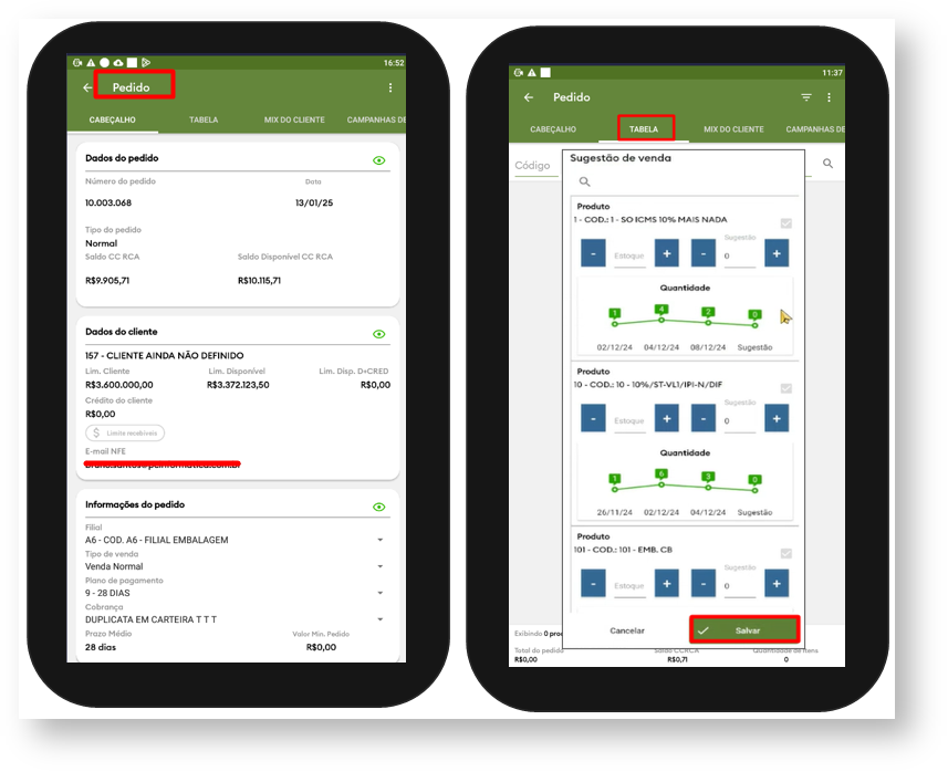 8- Ao acessar a aba Tabela irá surgir Sugestão de venda obrigando a informar a quantidade de estoque, clique em salvar para prosseguir com o Pedido.