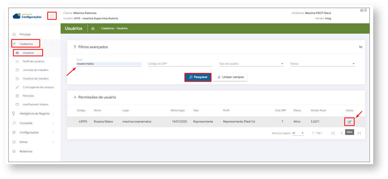 2- Busque pelo Usuário que deseja e clique no ícone de edição da coluna Ações