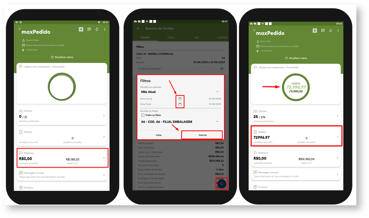 3.1 Na tela inicial do aplicativo acesse o card objetivos, clique no ícone de busca e seleciona o período desejado conforme imagem abaixo. Ao voltar para a tela inicial clique em atualizar menu, assim os valores serão apresentados conforme parametrizado e de acordo com mês atual.