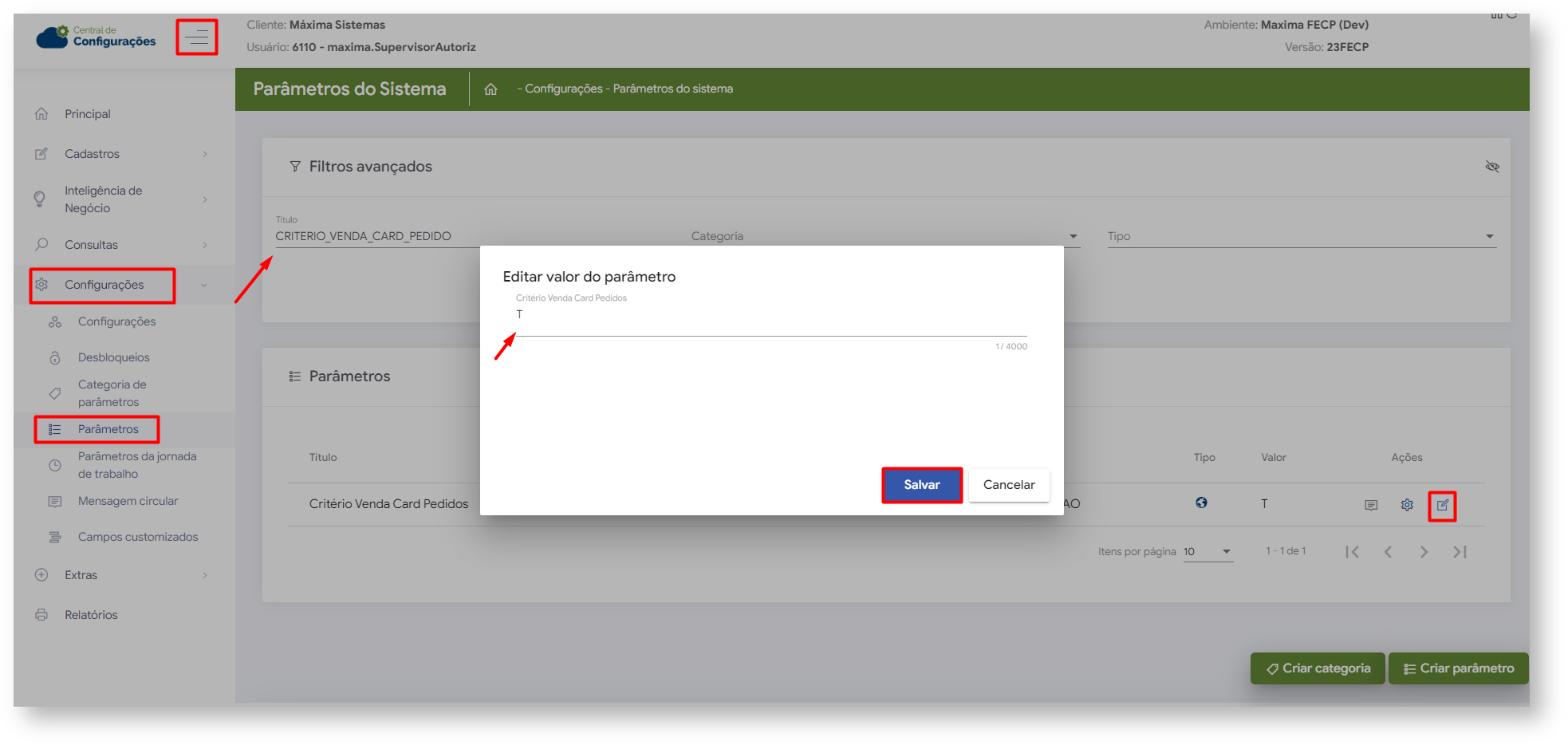 2.1 Na tela inicial da central de configurações menu lateral clique em configurações>> Parâmetros, busque pelo parâmetro CRITERIO_VENDA_CARD_PEDIDO e ou CRITERIO_VENDA_GRAFICO, habilite clicando no ícone , em ações, sendo que ao selecionar  L - indica Valor liquido, F - Valor faturado, T - transmitido.