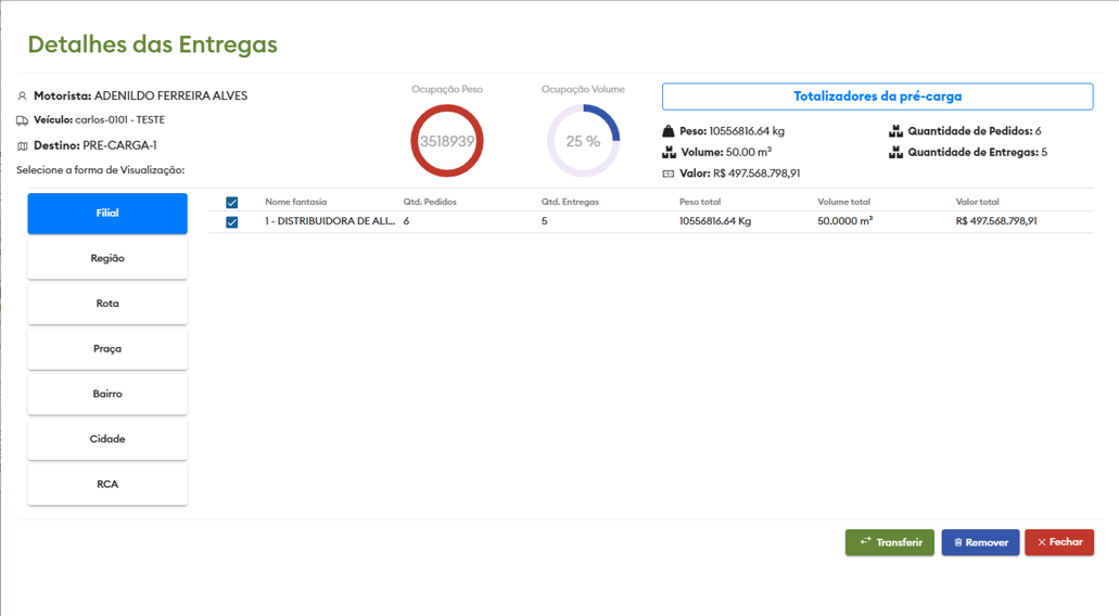 5 -  Na tela acima é possível ver os dados da pré-carga: Motorista, Veículo, Destino, Ocupação do veículo e os Totalizadores gerais.