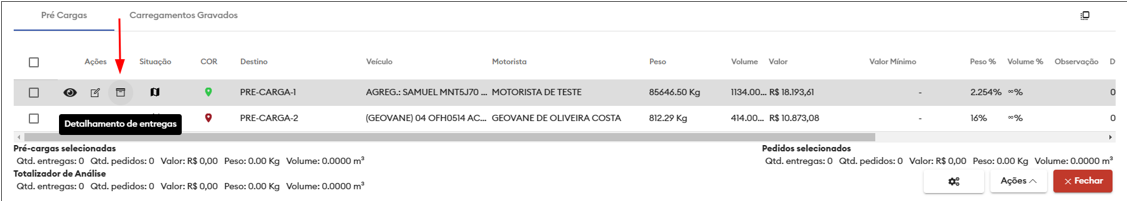 3 -  Ao abrir a grid de pré-cargas, um novo ícone está disponível para acessar o “Detalhamento de Entregas” como mostra a imagem abaixo: