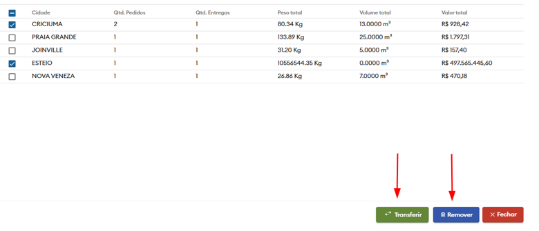 No exemplo abaixo, foi escolhido o agrupamento por CIDADE, onde mostra as entregas disponíveis para cada cidade. Logo depois é selecionado as seguintes cidades: POMBOS, GLORIA DO GOITA, contabilizando 2 entregas ao todo, que podem ser transferidas ou excluídas.