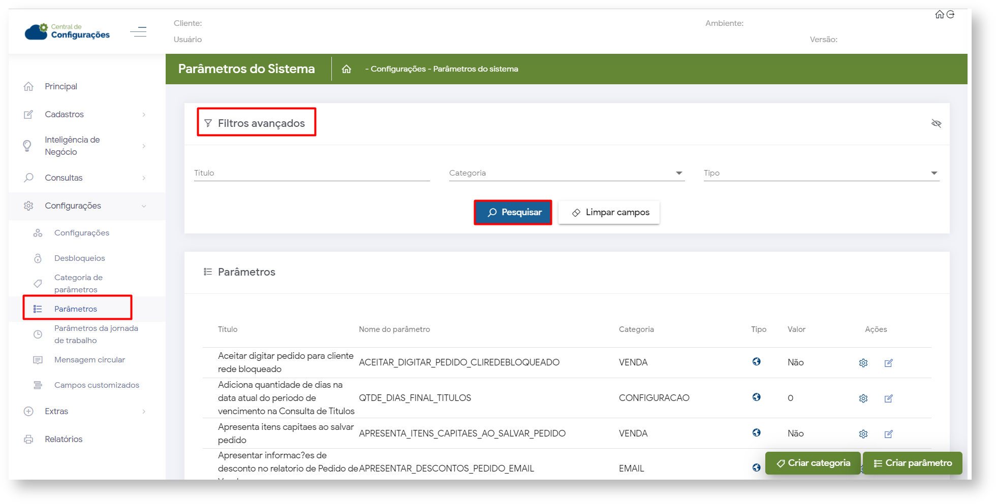 1.2 Informe o parâmetro ALERTA_TIT_VENCIDO  na tela de filtros avançados e clique em pesquisar.