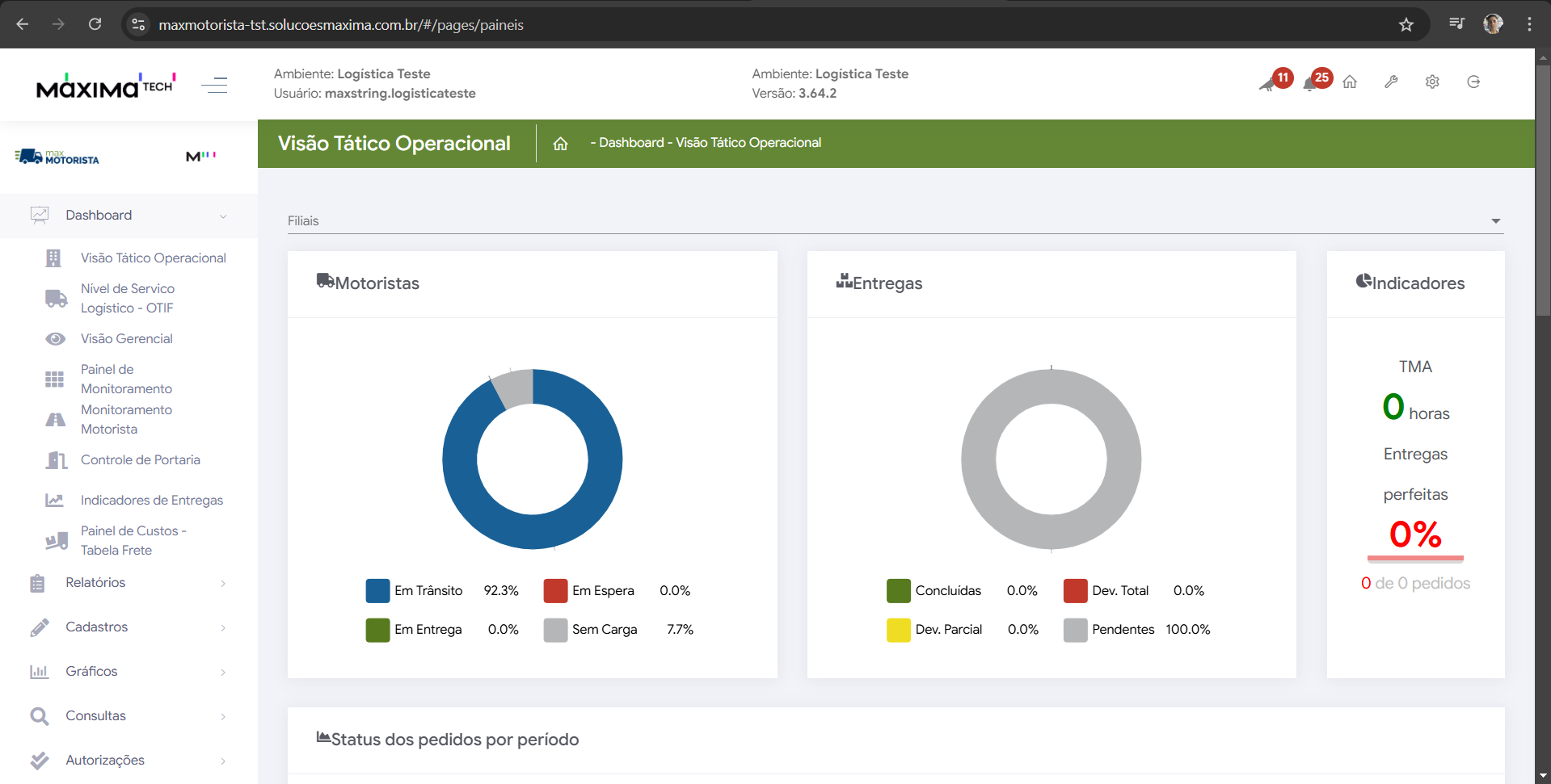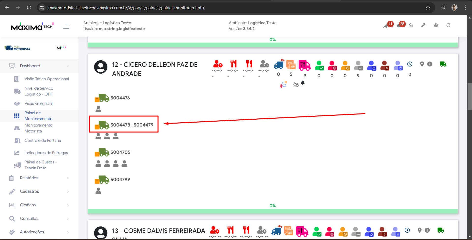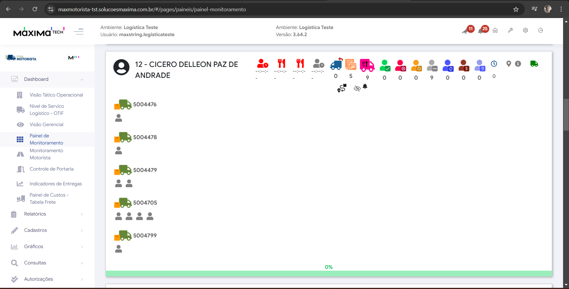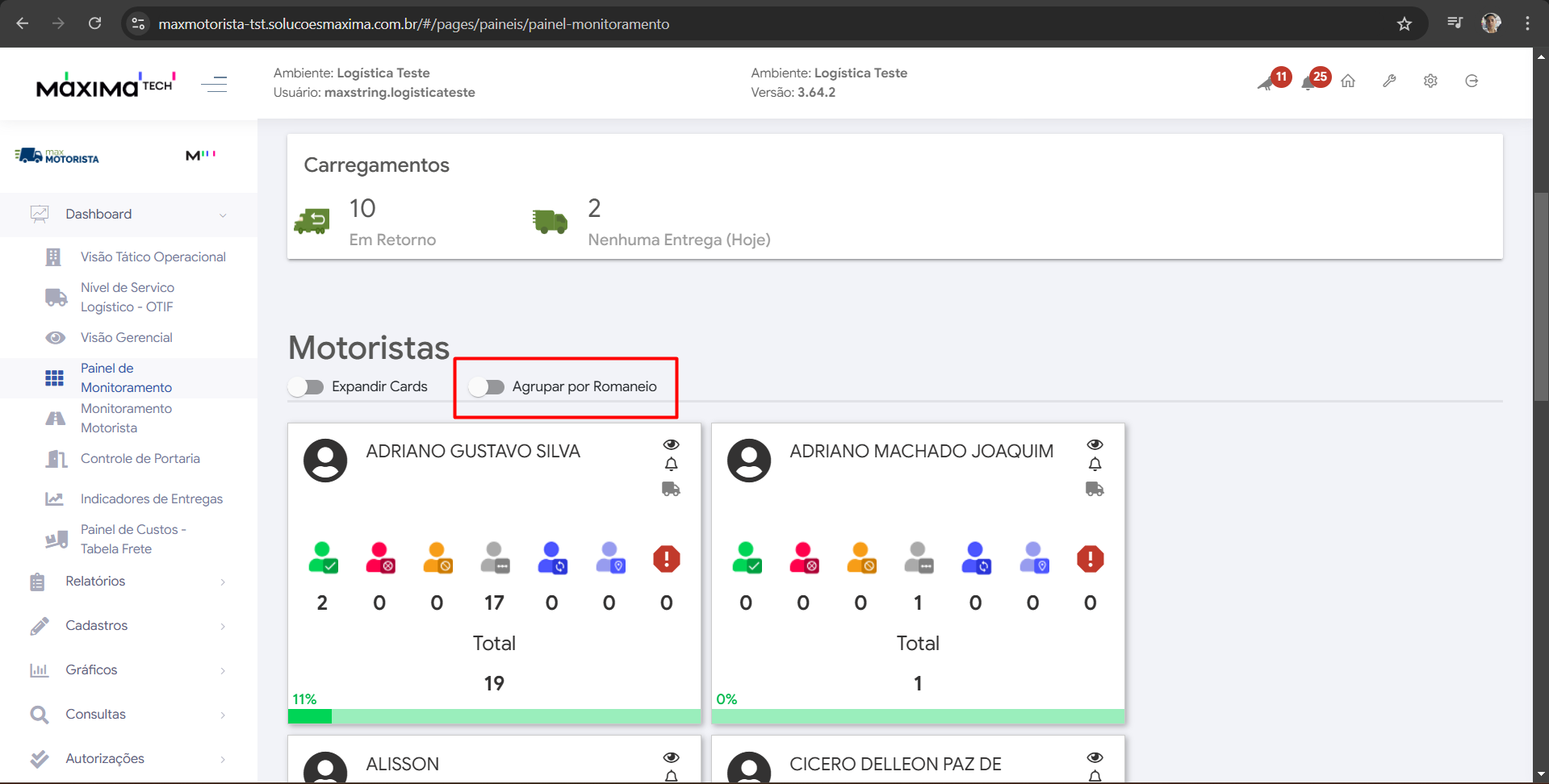 Monitoramento Consolidado por Romaneio: O usuário pode visualizar todos os carregamentos de um romaneio agrupados em um único bloco no painel, facilitando o acompanhamento de toda a operação de forma consolidada. Isso ajuda a identificar rapidamente o status geral de um romaneio específico.