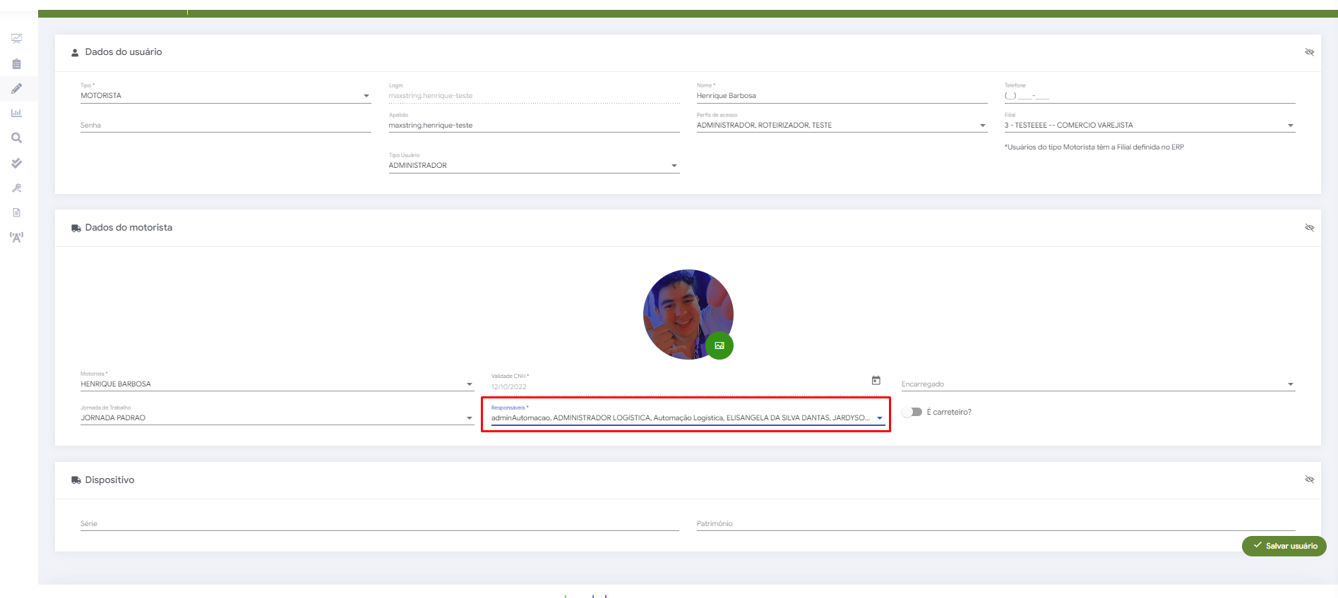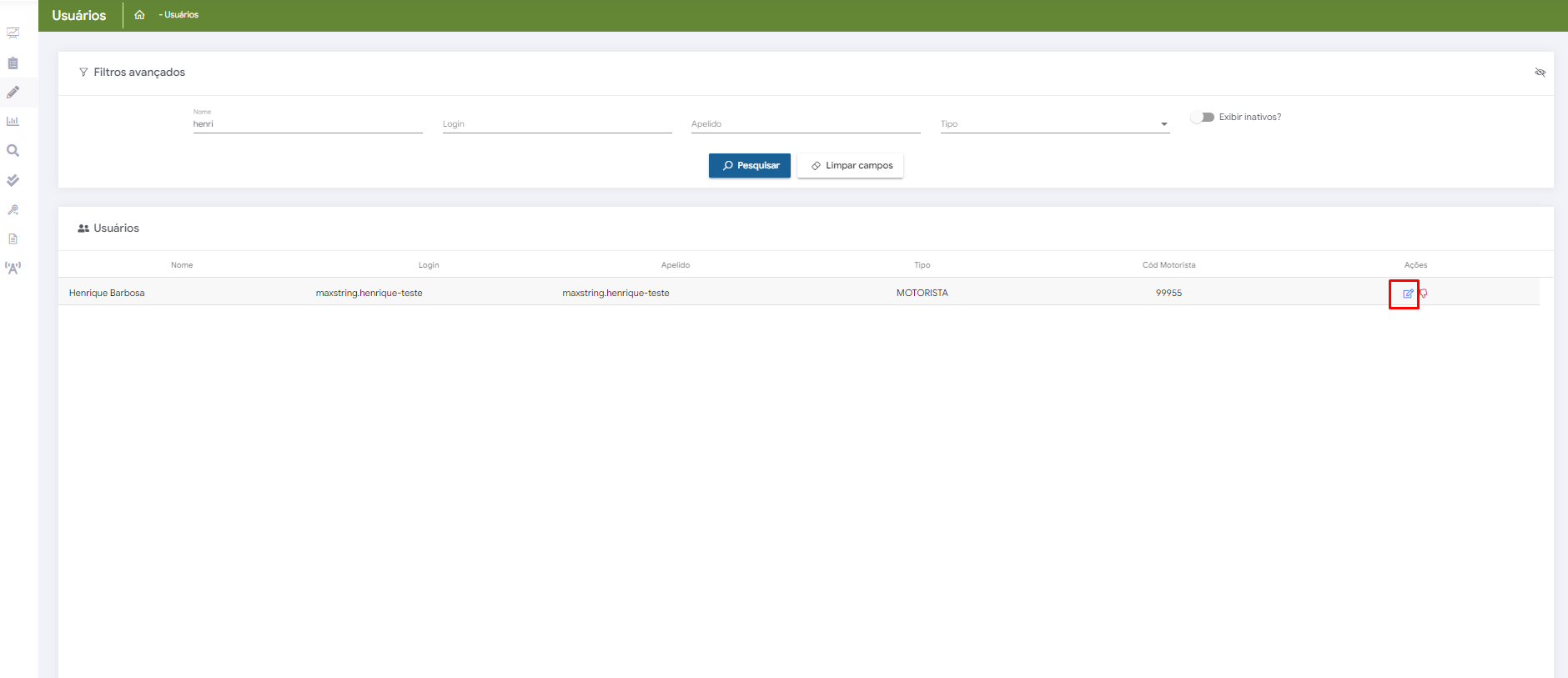 - Buscar o motorista que deseja vinculo de responsavel e ir na opção de ações/editar,