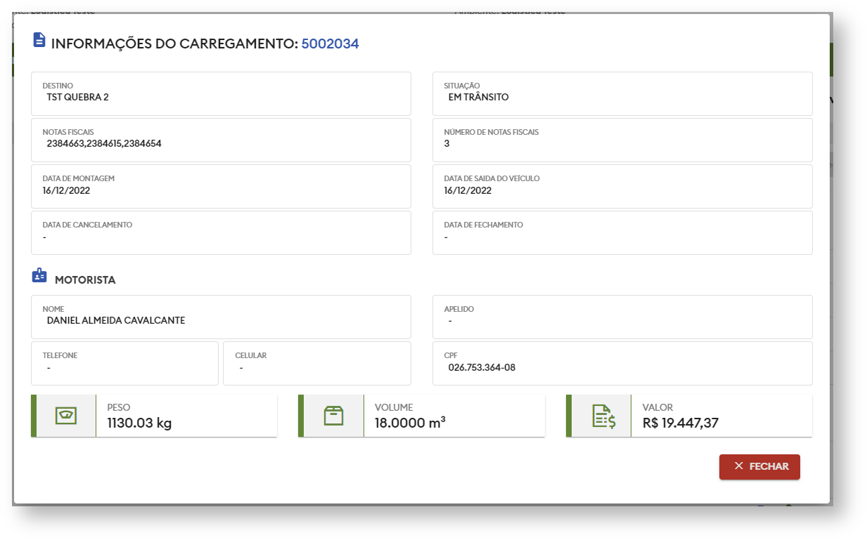 - Uma tela contendo as informações do carregamento será exibida.