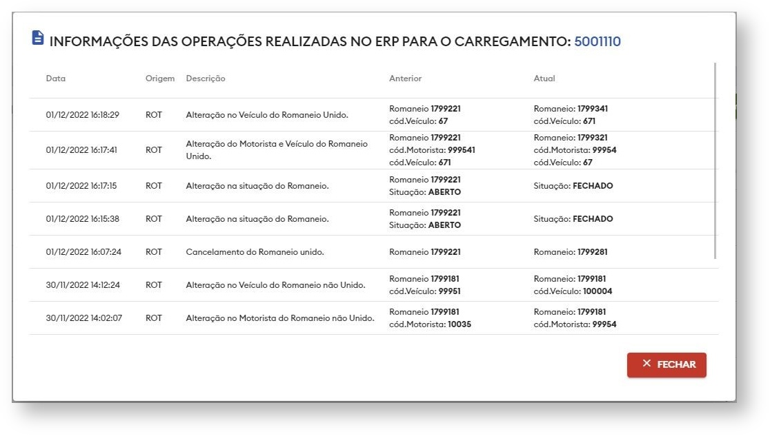 Será exibido uma tela contendo o histórico das operações realizadas para: CANCELAMENTO, SITUAÇÃO, ALTERAÇÃO DE MOTORISTA e ALTERAÇÃO DE VEÍCULO.