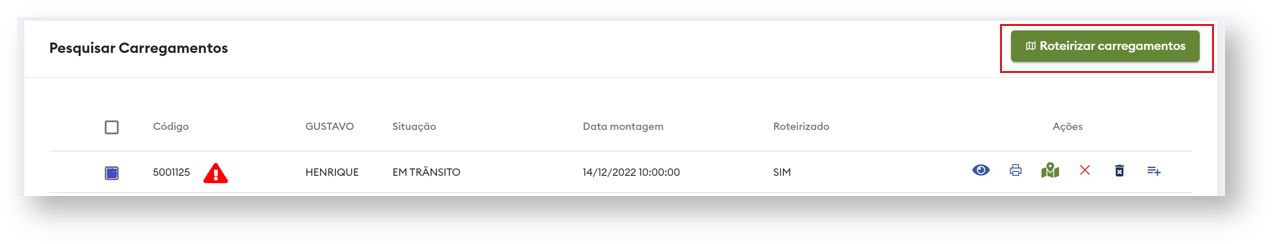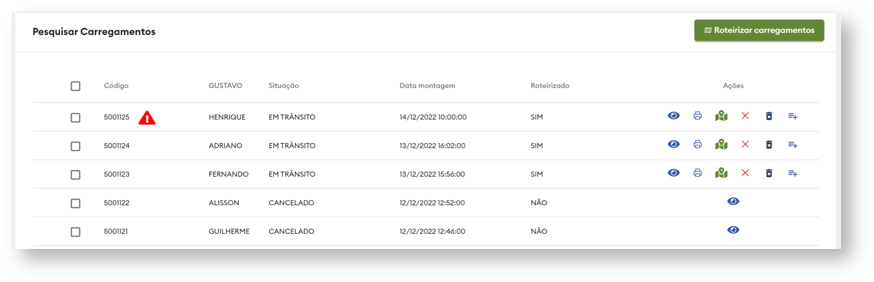 - Para cada carregamento é possível visualizar dados como: Código, Nome do motorista, Situação, Data da Montagem, Status de roteirização e ações disponíveis.