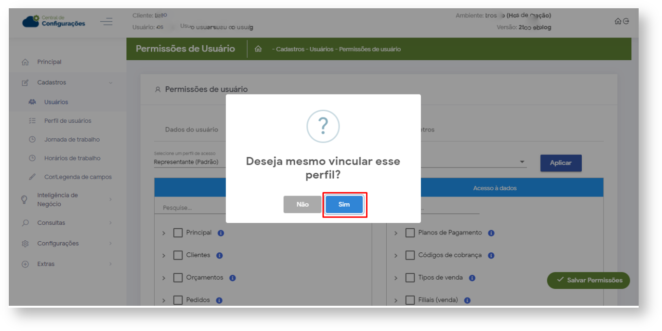 4- Será exibido na tela um Pop-up para que seja confirmado ou não o vinculo para o perfil. Clique na opção Sim para confirmar o vinculo.