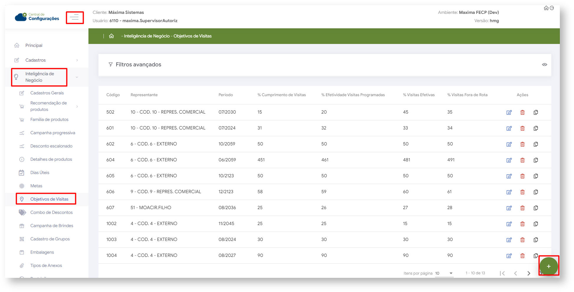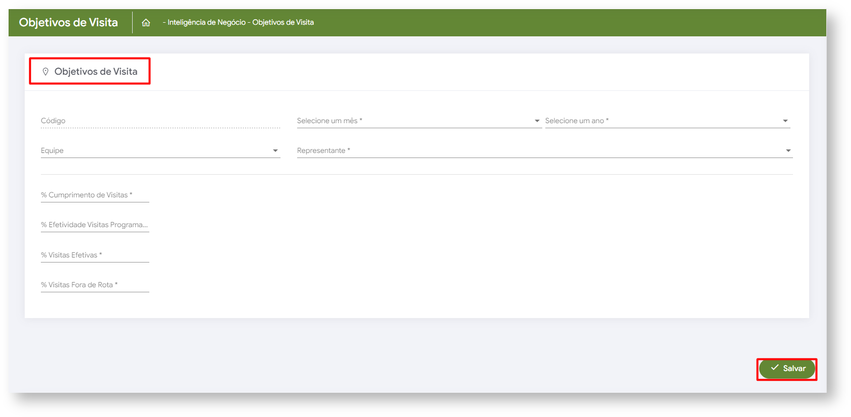 2-  clique em Inteligência de Negócios> Objetivos de visita