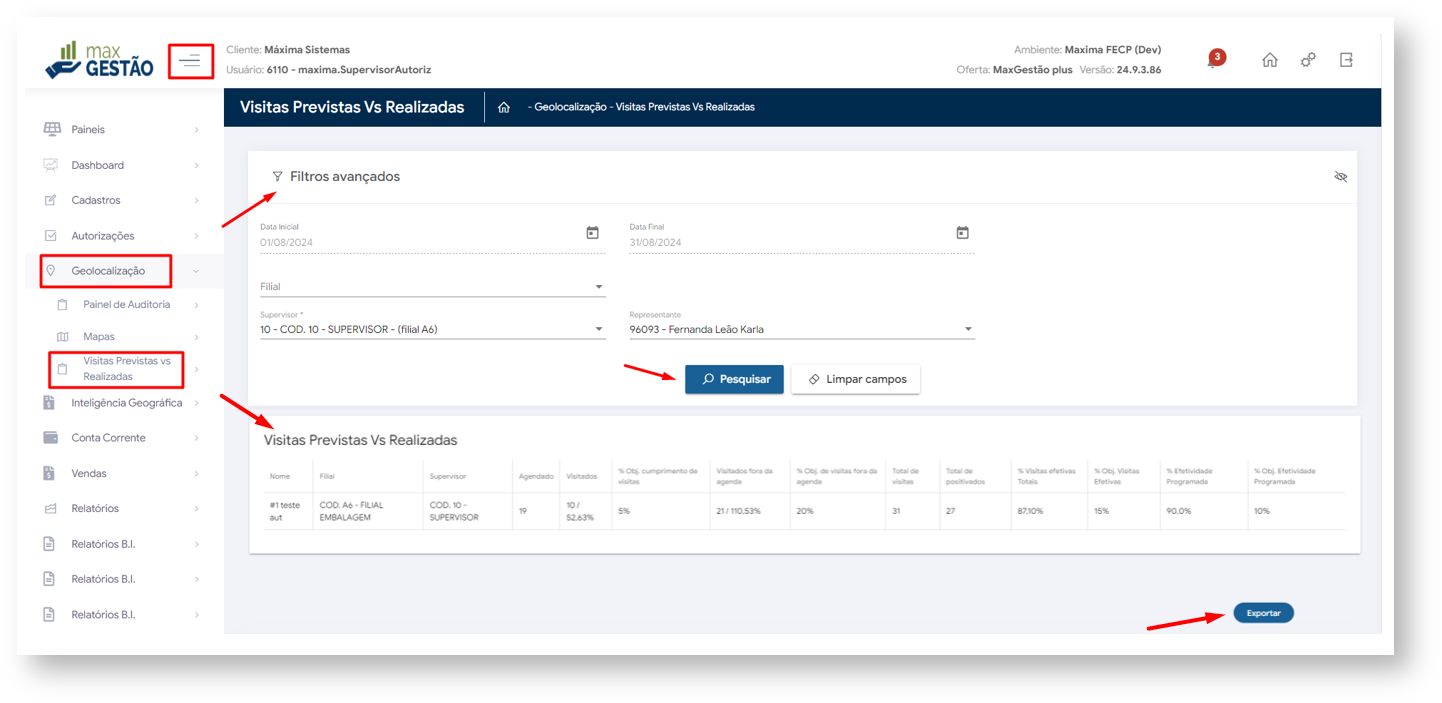 9- Para Acompanhamento do gestor, acesse maxGestão>Geolocalização>Visitas Previstas VS Realizadas.