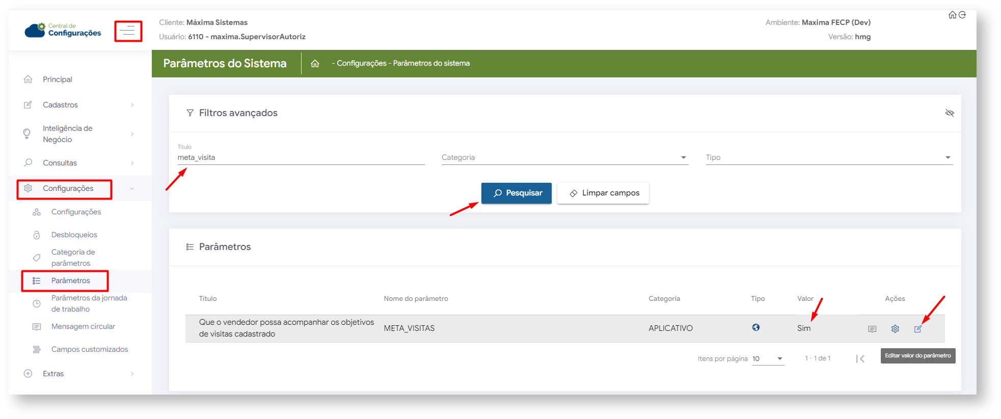 5- Na Central de Configurações clique em configurações> Parâmetros