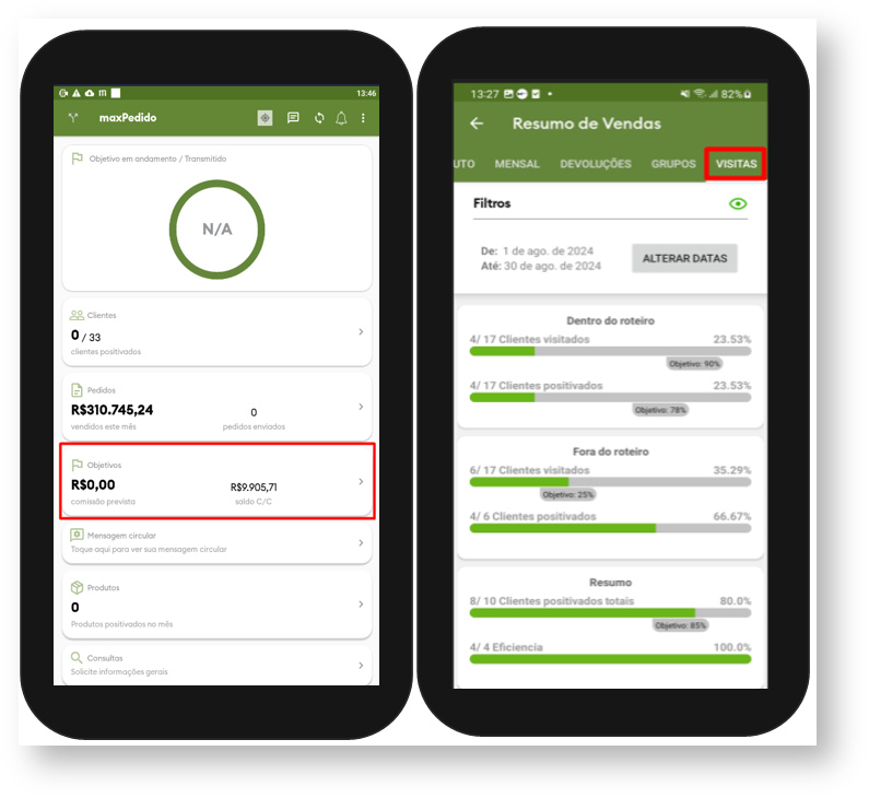 8- Para Acompanhamento no Aplicativo pelo vendedor, acesse o menu Objetivos> Resumo de vendas> aba Visitas.