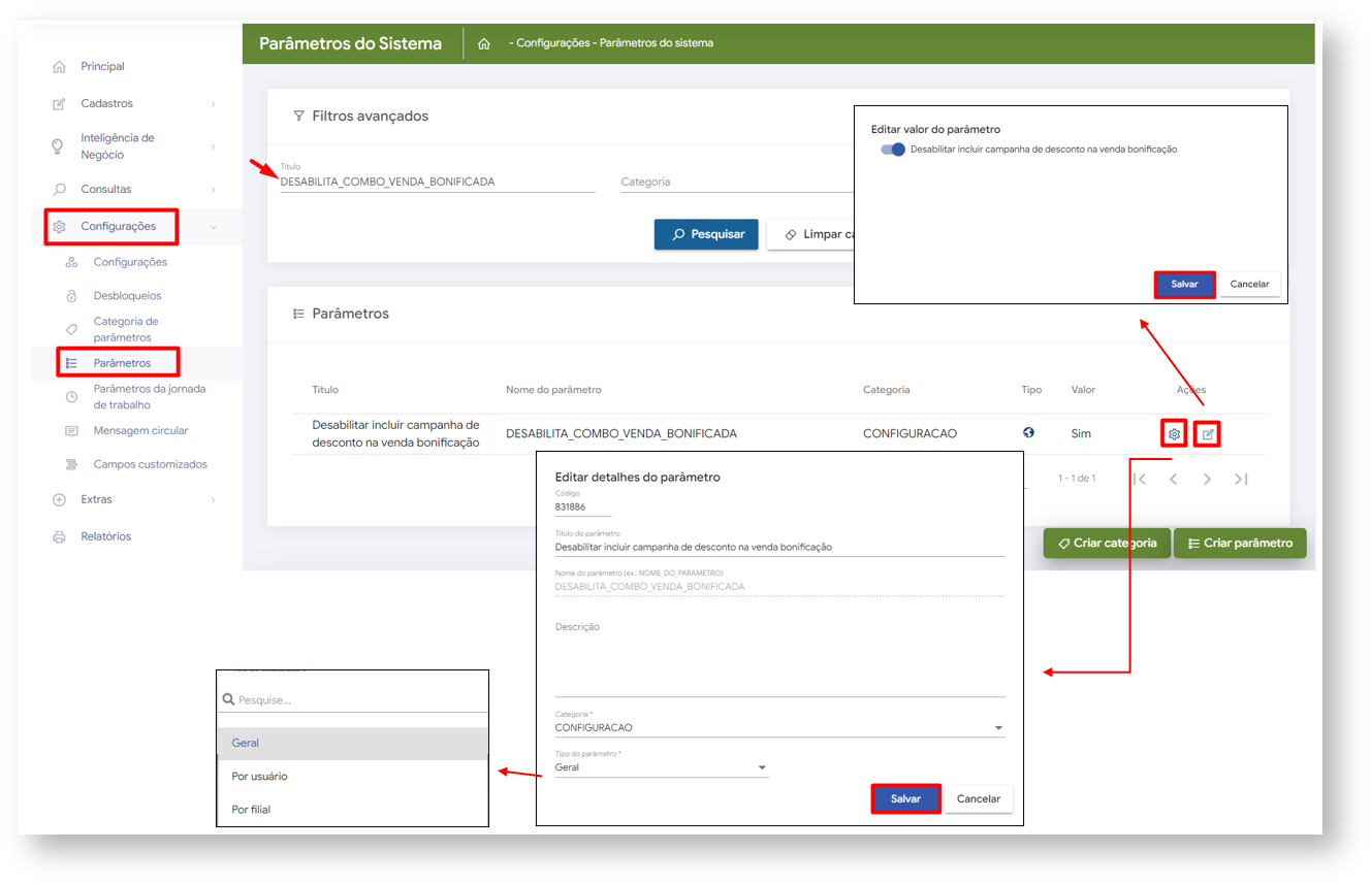 2.1 Ao acessar o maxPedido clique no Menu Configurações e depois em parâmetros , busque pelo parâmetro DESABILITA_COMBO_VENDA_BONIFICADA, através do ícone de edição  é possível alterar o valor dele, ou seja, habilitar ou desabilitar, através do ícone é possível alterar detalhes do parâmetro como por exemplo inserir uma descrição ao mesmo ou alterar o tipo dele para Geral, por usuário ou por filial.