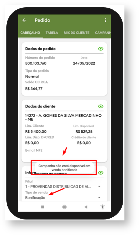 3.1 Na confecção de um pedido ao selecionar o tipo de venda "5 - Bonificação" se o parâmetro DESABILITA_COMBO_VENDA_BONIFICADA estiver habilitado, automaticamente será desabilitado o menu "CAMPANHAS DE DESCONTO" para que não seja possível acessar os combos, desta forma ao clicar no menu campanhas de desconto com o parâmetro habilitado o aplicativo volta para o cabeçalho do pedido e mostra a mensagem informando que a campanha não está disponível para esse tipo de venda.