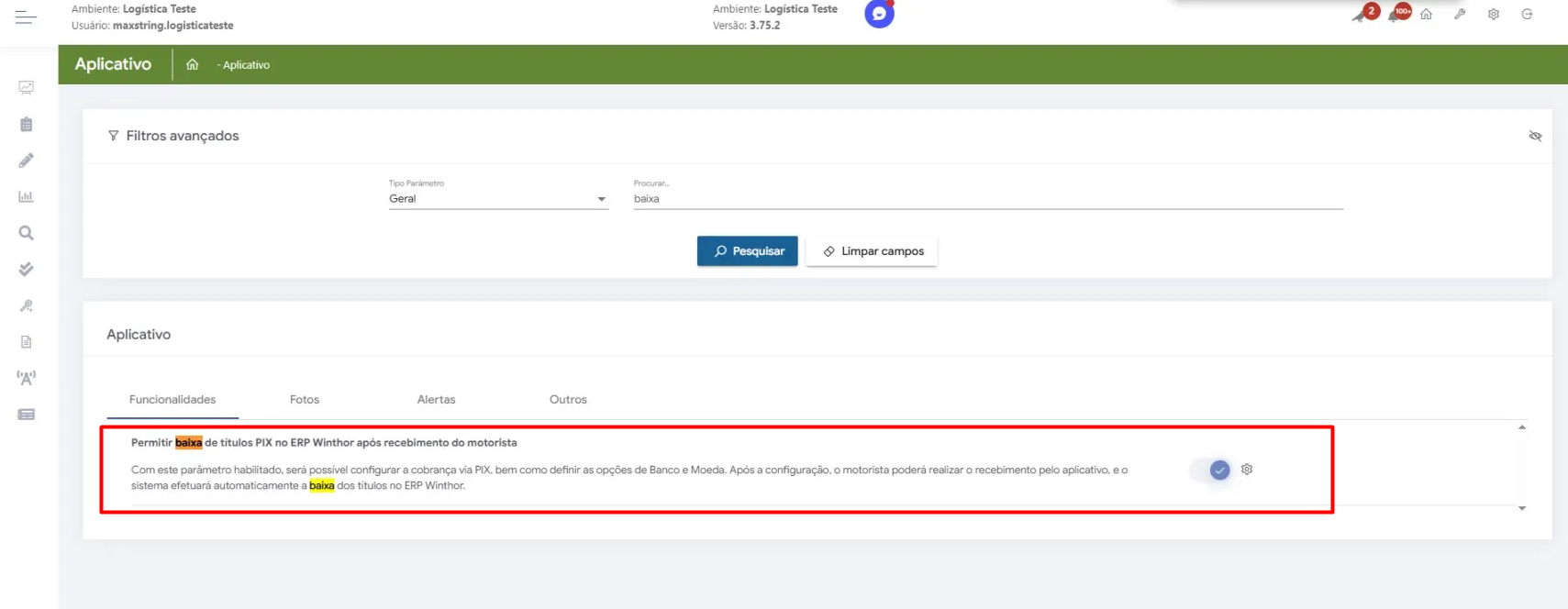 - Em seguida, acesse o MaxMotorista e habilite o parâmetro necessário para permitir a baixa automática de títulos via PIX.