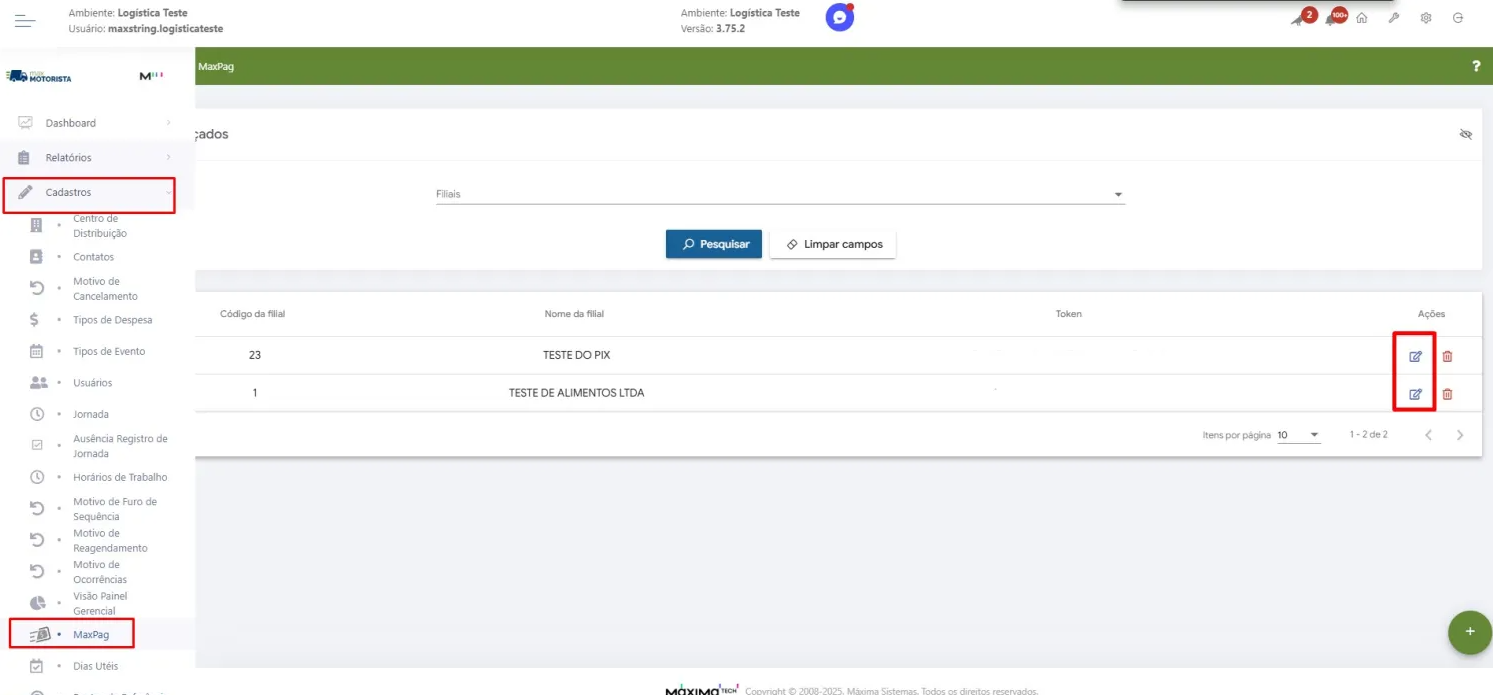 Acesse a aba de Cadastros no MaxPag e edite a filial que contempla o pagamento via PIX.