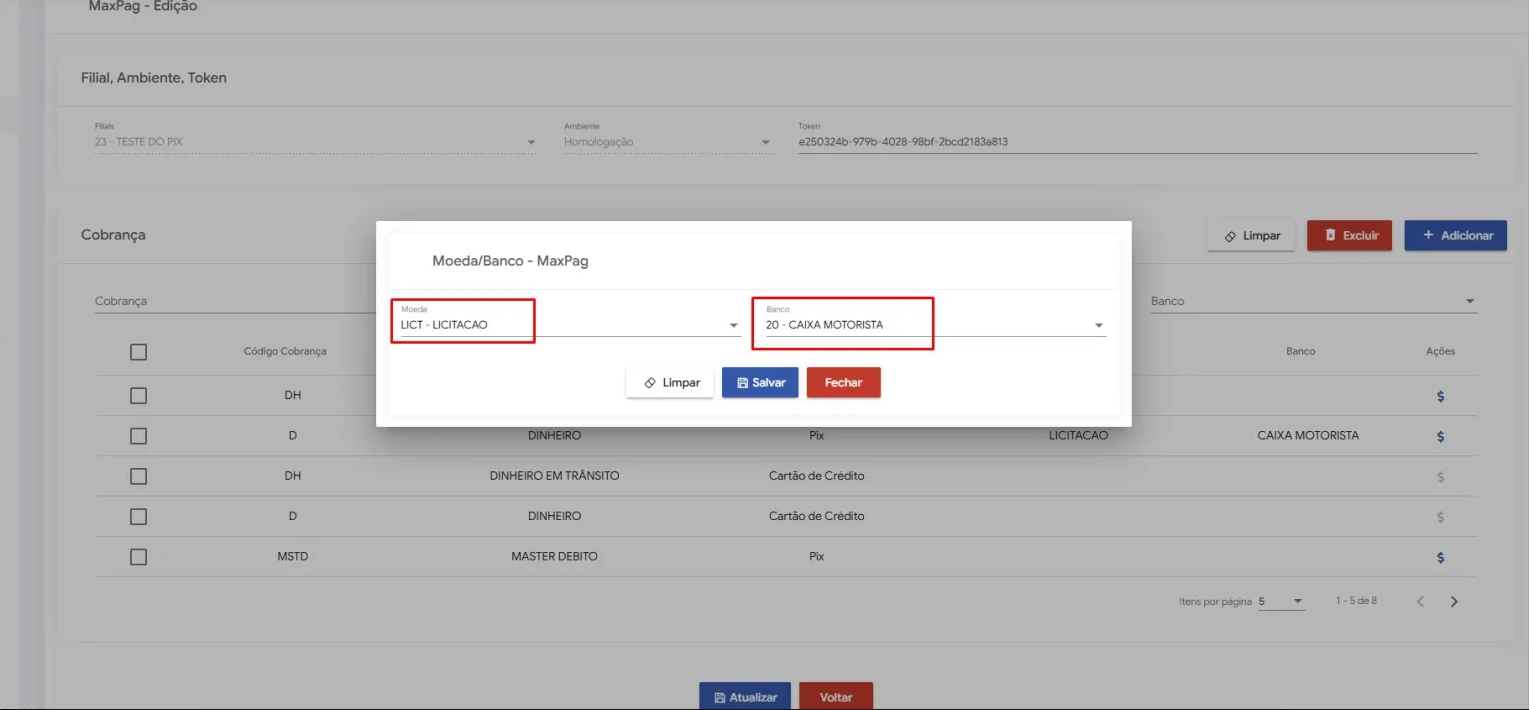 2. Com o parâmetro ativo, serão exibidas as opções de Banco e Moeda. Essas informações são provenientes do Winthor e devem estar cadastradas corretamente no ERP.