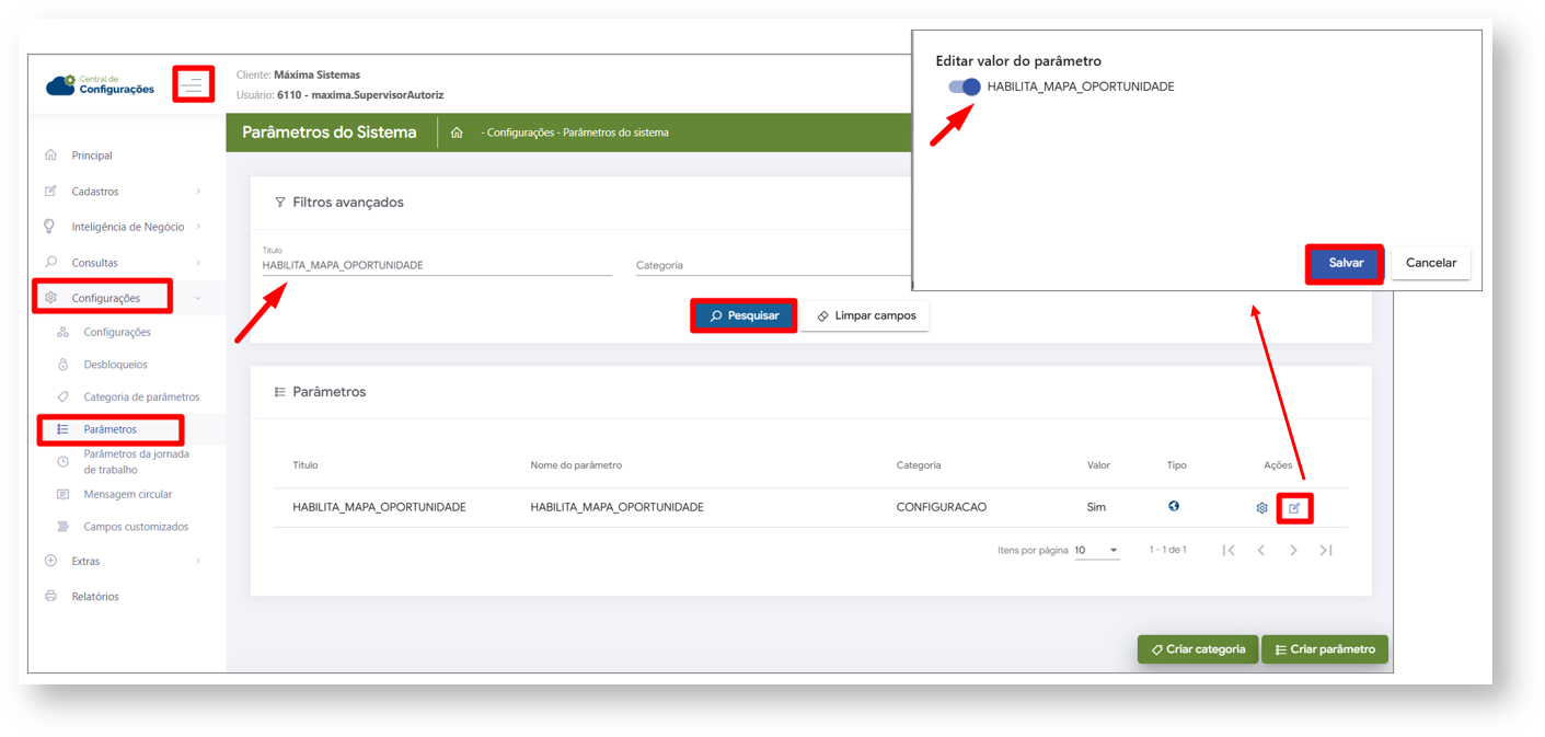 2- Busque pelo Parâmetro HABILITA_MAPA_OPORTUNIDADE, clique em pesquisar