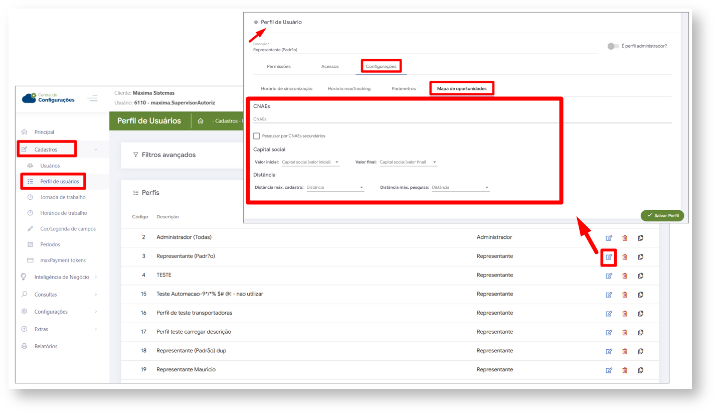 4- Ainda na Central  de Configurações do maxPedido, clique em, Cadastros  > Perfil de usuários