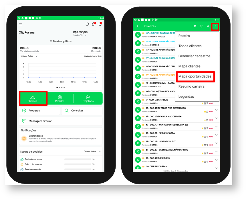 1- Na tela inicial do Aplicativo acesse, Clientes > ícone de Mais opções > Mapa de oportunidades