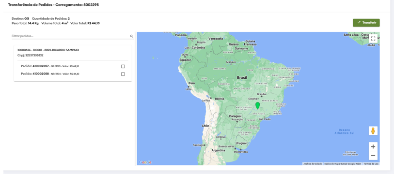 Uma vez selecionado os pedidos que deseja transferir, basta clicar no ícone a cima do mapa “Transferir”, que será aberto uma nova janela para escolher o destino do pedido e o motivo da transferência.