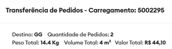 Clicando em “Salvar Transferência”, o pedido selecionado será transferido para o carregamento destino. Após a transferência concluir, o usuário é redirecionado para a tela de consulta de carregamentos.