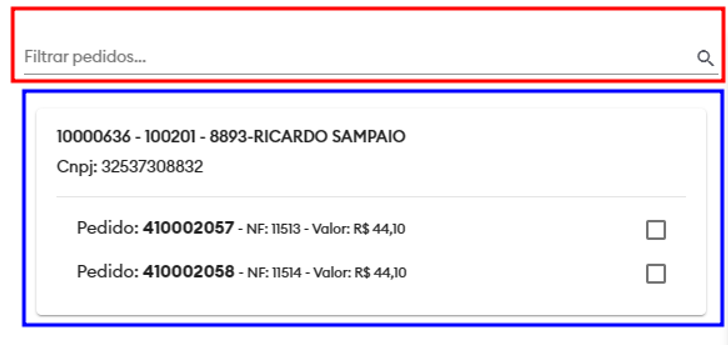 Na parte destacada em VERMELHO, é possível utilizar o filtro para encontrar um pedido específico. É possível passar como parâmetro para o filtro o nome do cliente, o CNPJ, o número do pedido ou o número da nota fiscal. Caso alguma dessas informações esteja presente no carregamento selecionado, a lista em AZUL é modificada para mostrar apenas o que foi pesquisado.