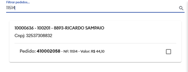 Ex: Buscando o pedido pelo número da nota fiscal (11514) que pertence ao pedido (410002058). Veja que apareceu apenas o pedido que pertence a essa nota.