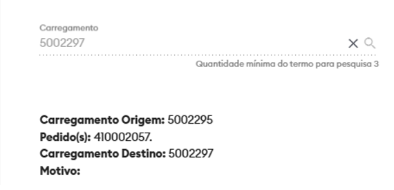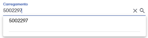 Deve escolher para qual carregamento o pedido ou pedidos serão transferidos. Para isso, basta digitar o número do carregamento e esperar que o sistema faça uma busca verificando se o carregamento existe. Caso ele exista, o número digitado será mostrado abaixo para ser selecionado, como mostra a imagem abaixo: