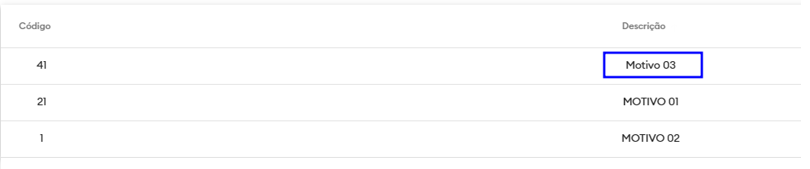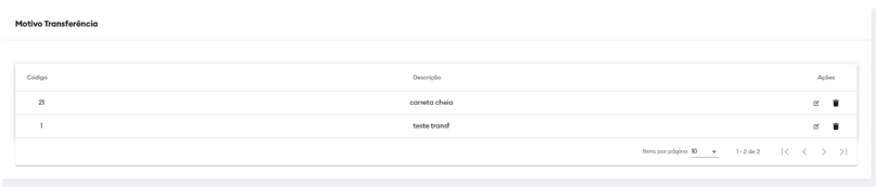 12.2 - Na tela de Motivo de Transferência é possível ver as transferências cadastradas: