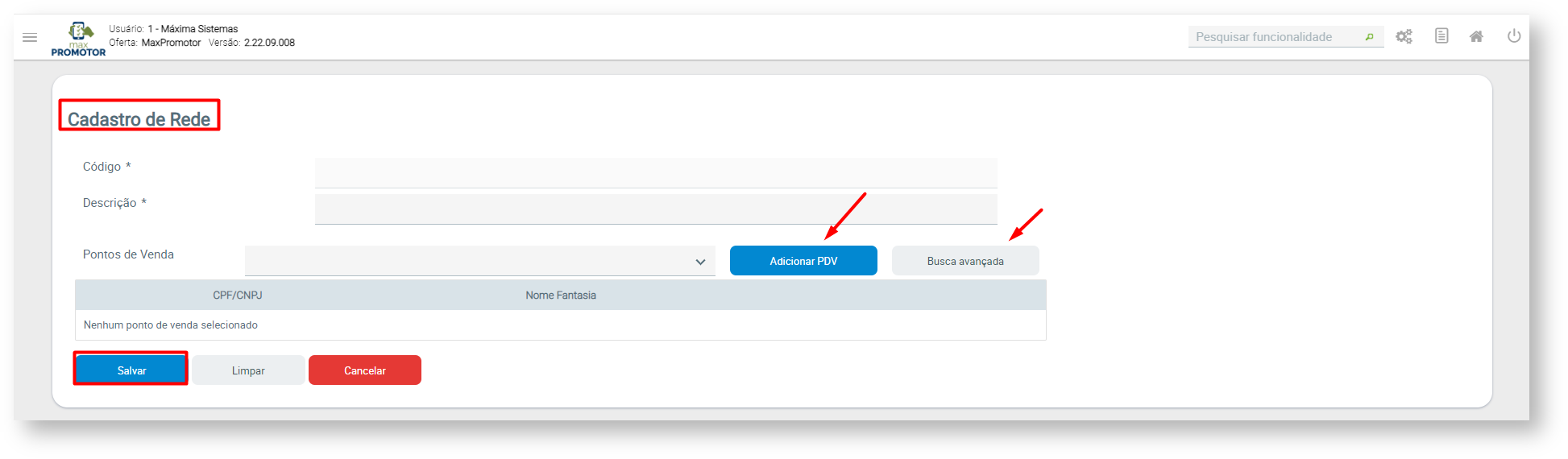 1.3 Preencha os dados da Rede, conforme a necessidade, lembrando que os campos que possuem o asterisco ( * ), são de preenchimento obrigatório. Em seguida adicione as lojas que pertencem a esta rede, clicando na opção Adicionar PDV ou em Busca Avançada. Após adicionar as lojas da Rede, clique no botão Salvar.