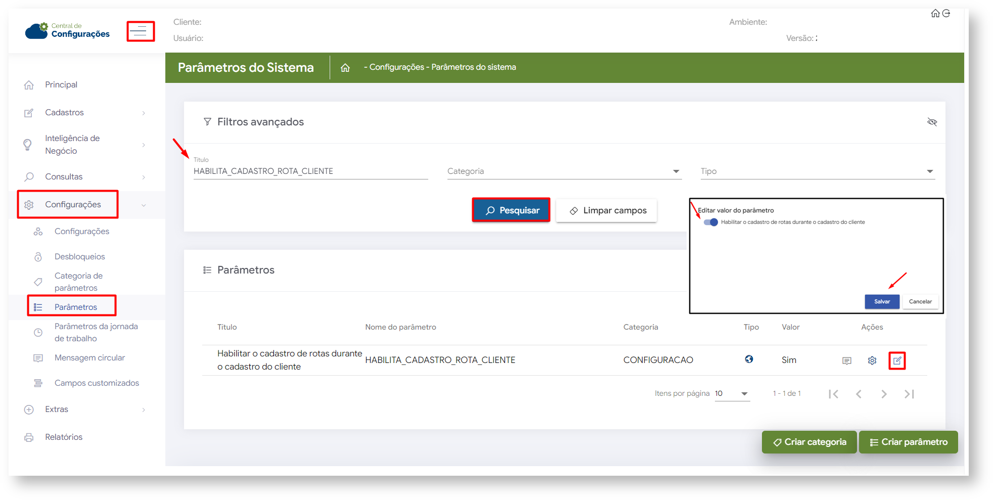 1.1 No Menu lateral da Central de configurações clique em Configurações>> Parâmetros, busque pelo parâmetro abaixo mencionado, em ações clique no ícone   para habilitar o mesmo.