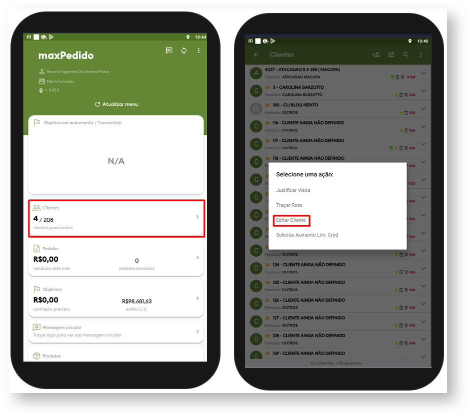 2.1.0 Na tela inicial do maxPedido Aplicativo selecione a aba clientes>> clique longo no cliente desejado>> selecione opção Editar Cliente