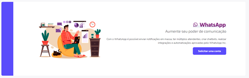 2 – Após a contratação da Zenvia, solicitar uma conta do WhatsApp através do menu de produtos -> canais de comunicação -> WhatsApp: