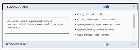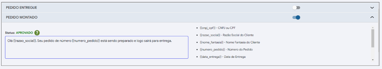 10 – Após habilitado o envio de um status, a mensagem pode ser personalizada para o mesmo. Algumas chaves podem ser inseridas no corpo da mensagem para preencher a mesma com informações específicas do pedido: