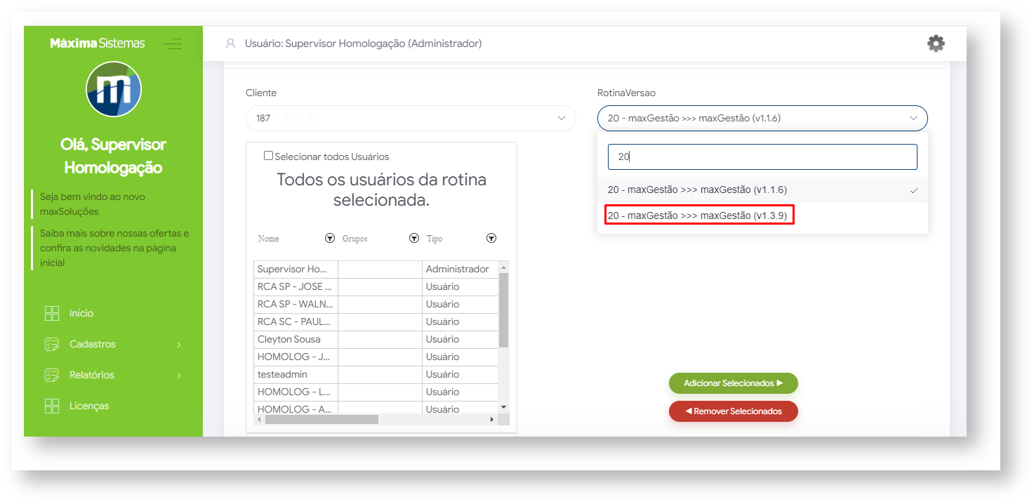 1.7 - Refaça o mesmo processo para liberar a versão do aplicativo, selecionando o item 20 - Maxgestão>>> maxGestão (v.x.x) e atribuindo aos usuários selecionados cadastrados.