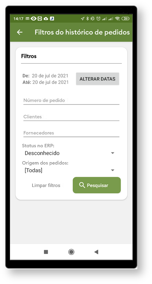 Ao clicar em Histórico de Pedidos, abrirá uma nova tela solicitando que seja selecionado o período que deseja pesquisar os pedidos. Ao clicar em Pesquisar já serão emitidos os pedidos na tela.