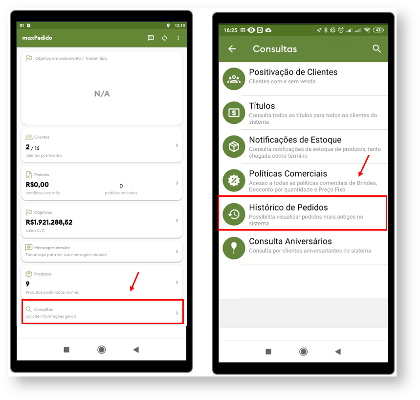 1.0 Ao acessar o aplicativo do maxPedido clique na aba Consultas e depois em Histórico de Pedidos.