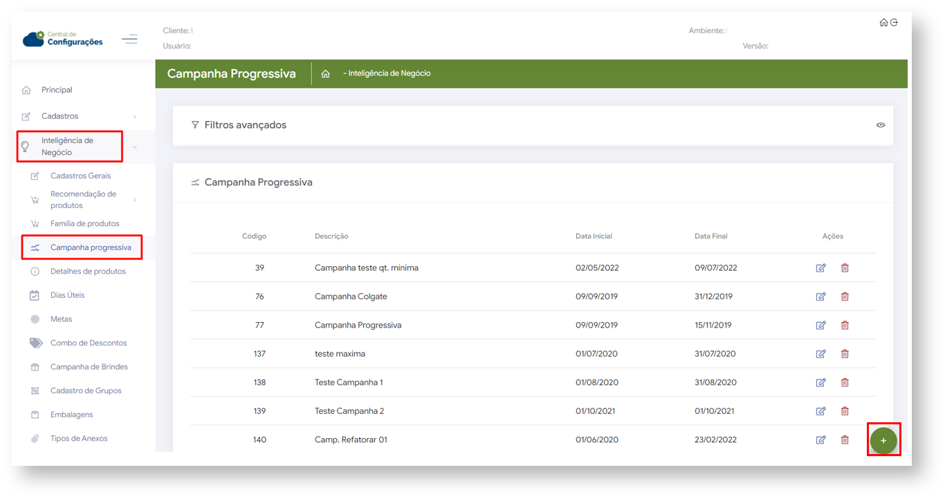 2.1 Ao acessar o maxPedido Web no Menu lateral clique em Inteligência de Negócio e posteriormente em Campanha Progressiva, clique no ícone  para iniciar cadastro de nova campanha.