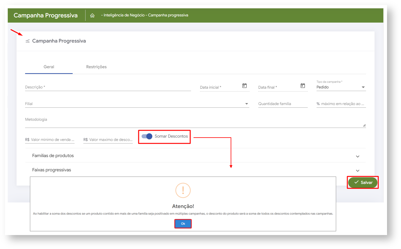 2.2 No cadastro de nova campanha ao marcar a opção Somar Descontos, irá apresentar uma caixa de dialogo informando que "Ao habilitar a soma dos descontos se um produto contido em mais de uma família seja positivado em múltiplas campanhas, o desconto do produto será a soma de todos os descontos contemplados nas campanhas" clique em salvar para validar as informações cadastradas.