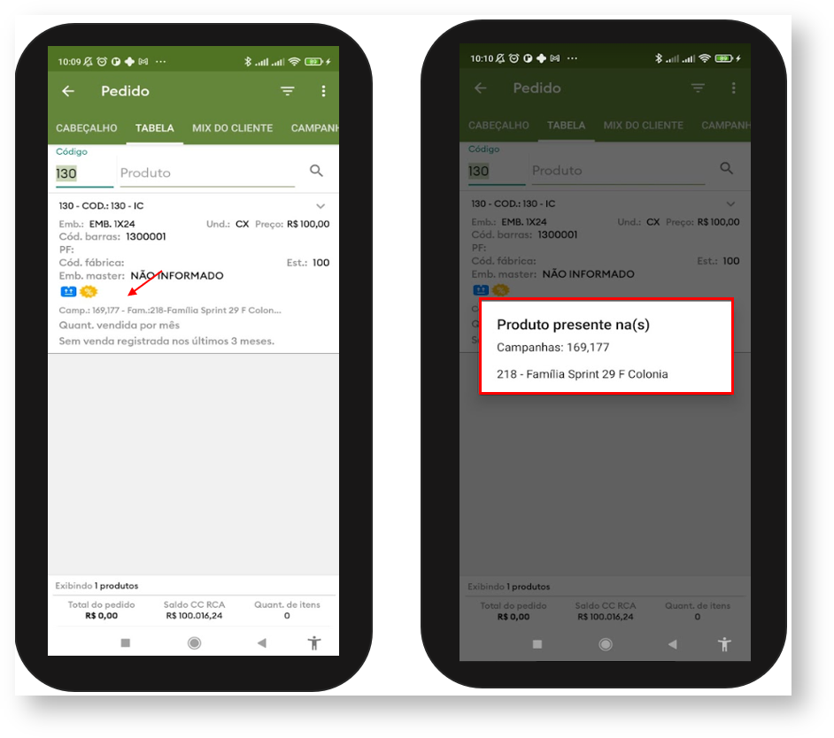 3.1 Ao iniciar um novo Pedido clique aba Tabela, na listagem do produto é possível ver a legenda da(s) campanha (s) que o item faz parte, ao clicar sobre ela abre uma janela com a descrição informando qual família aquele produto pertence.