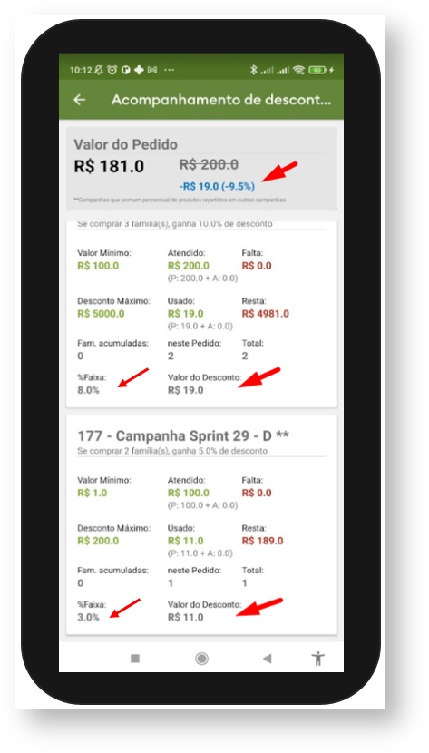3.2 Quando a opção Somar Descontos na central de configurações estiver selecionada conforme item 2.2, as campanhas devem somar os descontos, na tela de acompanhamento de campanha progressiva é possível visualizar as campanhas por card, as informações referente a elas, o valor do pedido, levando em consideração somente itens inclusos em campanha, o valor do desconto por campanha e também o valor total de desconto no Pedido.