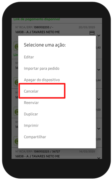 2- Após criado e habilitado como "S",  clicando e segurando sobre o pedido que contenha um brinde o usuário poderá enviar para cancelamento o pedido que possuir um pedido brinde atrelado a ele, conforme imagem abaixo.