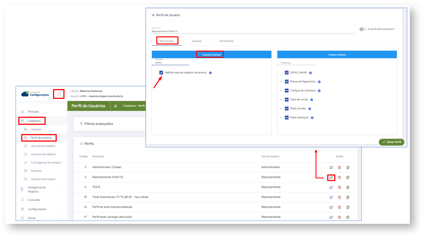 2.1 Para que o usuário tenha acesso a aba Anexos, é necessário habilitar a permissão na Central de configurações> Menu lateral> Cadastro> Perfil de Usuários>  clique no ícone de edição  , na aba Permissões> Acesso a Rotinas, permissão Habilitar aba de cadastro de anexos.