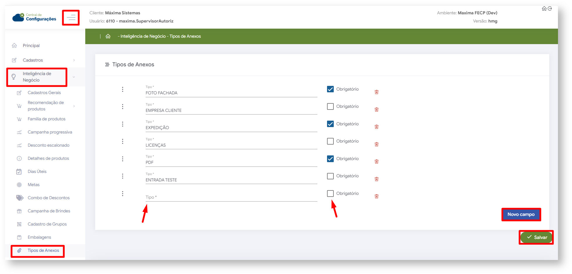 1.1 No menu lateral  , clique em Inteligência de Negócios >> Tipos de anexos, posteriormente clique em novo campo e preencha o tipo desejado, se o mesmo é obrigatório para a conclusão do cadastro do cliente e salve. Caso necessário é possível excluir tipo de anexo cadastrado clicando no ícone